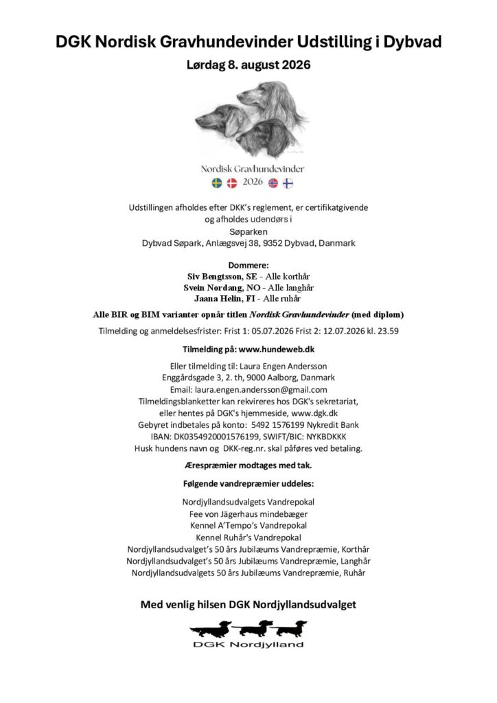 Danmark i august? 14. januar 2026 by Webmaster Skriv en kommentar Våre danske venner arrangerer Nordisk Gravhundevinder i Dybvad i august. Noe for deg? ANNONSE