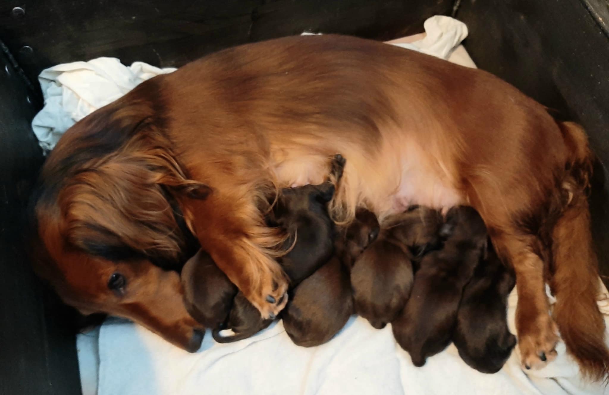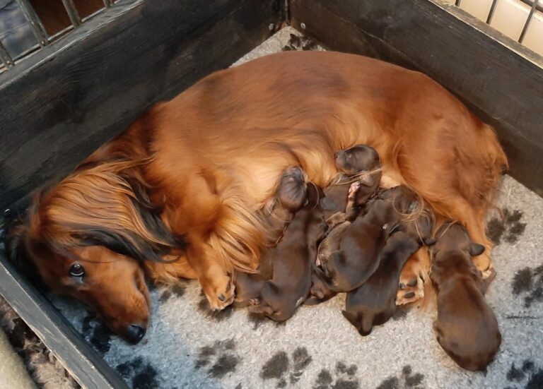 13.10.2025 ble det født 7 velskapte valper hos Kennel Søril etter høyt premierte, friske, øyelyste og gentestede foreldre. Alle valpene er røde (med innslag av sorte dekkhår)